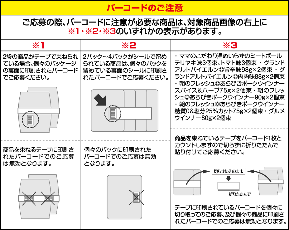 ※お一人様何口でもご応募いただけますが、ハガキ1枚につき1口とさせていただきます。※複数枚のハガキを封書でまとめてご応募いただくことも可能ですが、必ずハガキ1枚ごとに、上記必要事項をご記入の上、必要な枚数のバーコードを貼付ください。