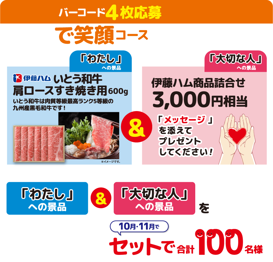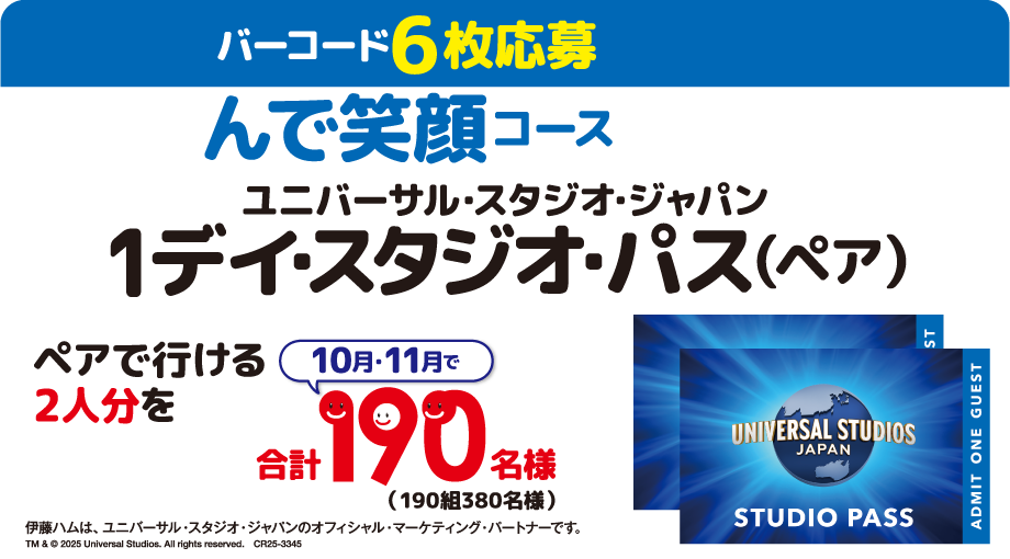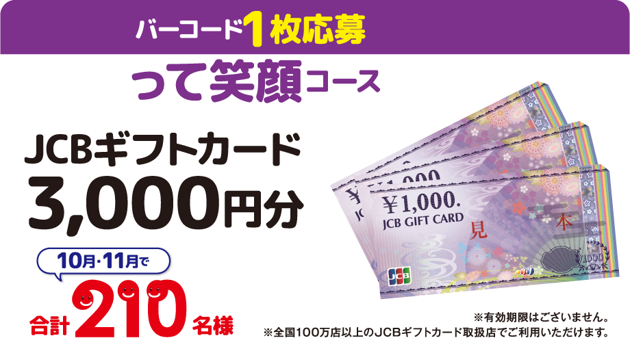 各月厳正なる抽選の上、「遊んで笑顔コース」「買って笑顔コース」は10月ご応募分ご当選者には12月下旬頃に、11月ご応募分ご当選者には2026年1月下旬頃に景品の発送をもって、「Wで笑顔コース」は10月ご応募分ご当選者には11月中旬頃に、11月ご応募分ご当選者には12月下旬頃に、ご当選の連絡をもって発表に代えさせていただきます。「Wで笑顔コース」は弊社指定期間内でお届け希望日を伺い、お届けいたします。